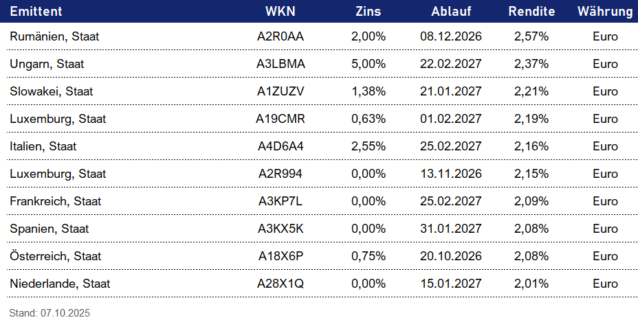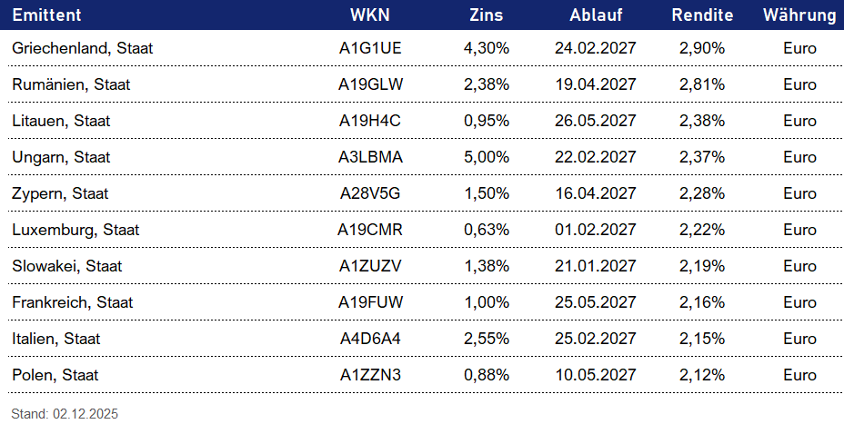 Die Aufstellung der Wertpapiere dient ausschließlich zu Informationszwecken und stellt keine Anlageberatung dar. Alle Inhalte sind nicht als Empfehlung oder Aufforderung zum Kauf, Verkauf oder zur Haltung von Wertpapieren zu verstehen. Wir übernehmen keinerlei Gewährleistung oder Haftung für die Richtigkeit, Vollständigkeit oder Aktualität der bereitgestellten Inhalte. Anlageentscheidungen sollten stets auf Basis einer individuellen Beratung und eigener sorgfältiger Prüfung getroffen werden.