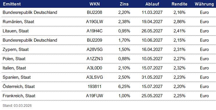 Die Aufstellung der Wertpapiere dient ausschließlich zu Informationszwecken und stellt keine Anlageberatung dar. Alle Inhalte sind nicht als Empfehlung oder Aufforderung zum Kauf, Verkauf oder zur Haltung von Wertpapieren zu verstehen. Wir übernehmen keinerlei Gewährleistung oder Haftung für die Richtigkeit, Vollständigkeit oder Aktualität der bereitgestellten Inhalte. Anlageentscheidungen sollten stets auf Basis einer individuellen Beratung und eigener sorgfältiger Prüfung getroffen werden.